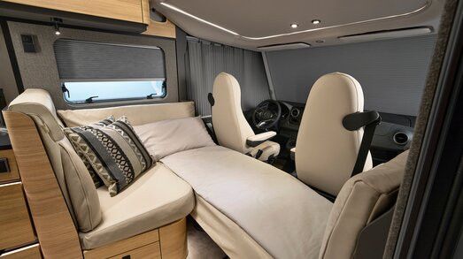 Elektrischer Rollladen im Bug inkl. Sichtschutzrollo für Frontschreibe (von unten nach oben zuziehbar) und Sonnenblendenfunktion